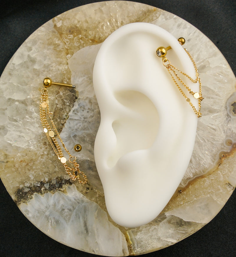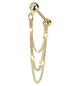 Golden, dangling stainless steel triple chain piece that is decorated with flat disks throughout. The wearable size of the barbell is 16G with a 5/16" (8mm) wearable length. The chain length measures about 30mm. On the barbell is a 4mm clear cz gem with a 3mm ball on the other end. Both ends are externally threaded. Made from gold pvd on 316L stainless steel. Sold individually. For healed piercings.