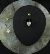 Lovely heart shaped belly button ring made from gold pvd on ASTM F-136 titanium and clear, cz gems. Top cz gem is bezel set and heart cz is prong set. This piece is externally threaded and comes in size 14G with a 3/8" (10mm) length. Sold individually.