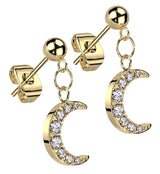 Hoop-style earrings with a dangling crescent moon design that is filled with sparkling clear cz gems. Made from gold pvd on 316L stainless steel. Size is 20G. Length is 1/4" (6mm). Stud design with butterfly backs. Ball end in front: 4mm. Sold in pairs (2 pieces).