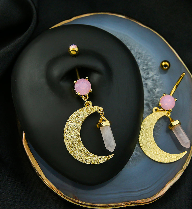 Indulge in the celestial beauty of our Gold PVD Crescent Moon Rose Quartz Dangle Belly Button Ring. Made with durable 316L stainless steel, it features a 14 gauge, 3/8" (10mm) barbell adorned with a pretty rose quartz crystal and CZ gems. The dangle design, measuring 28mm x 21mm, is fun choice for your healed belly button piercing.