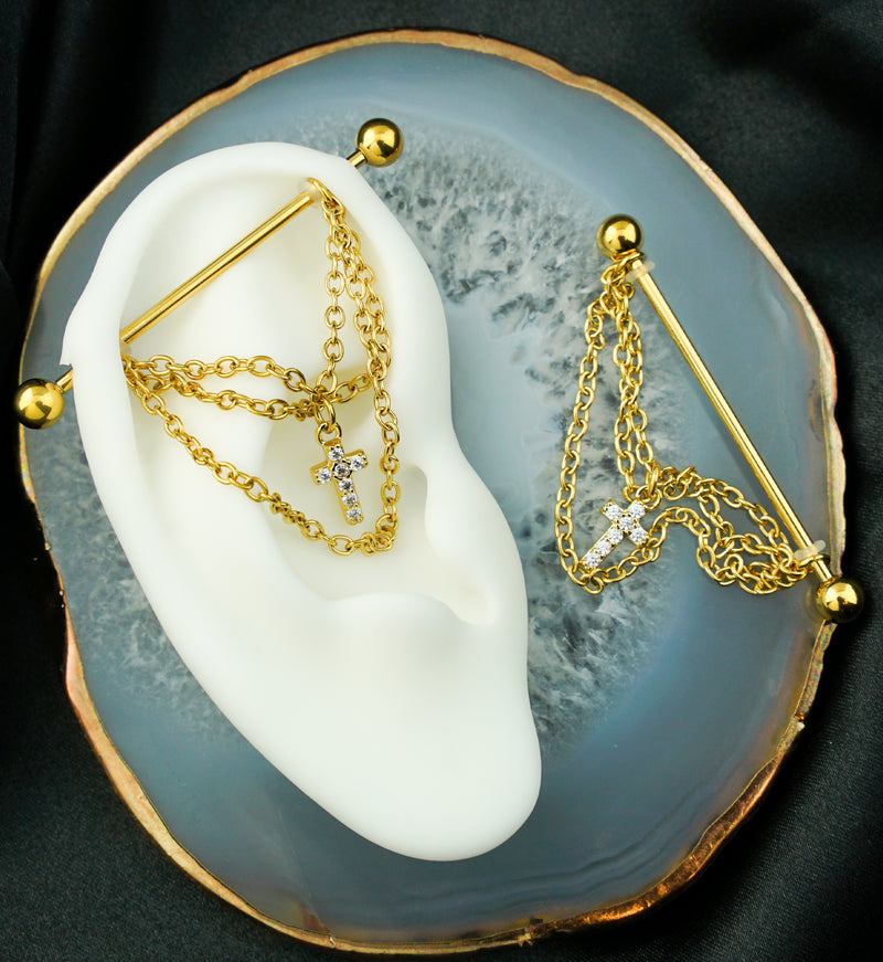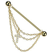 This golden, industrial barbell has a triple dangling chain design with a centered, cross design that is filled with pave, clear cz gems. Dangling design measures 40mm x 30mm and is made with gold pvd on 316L stainless steel. The size is 14G with a barbell length of 1&1/2" (38mm). It has a 5mm externally threaded balls on each end. Meant for healed piercings. Sold individually.
