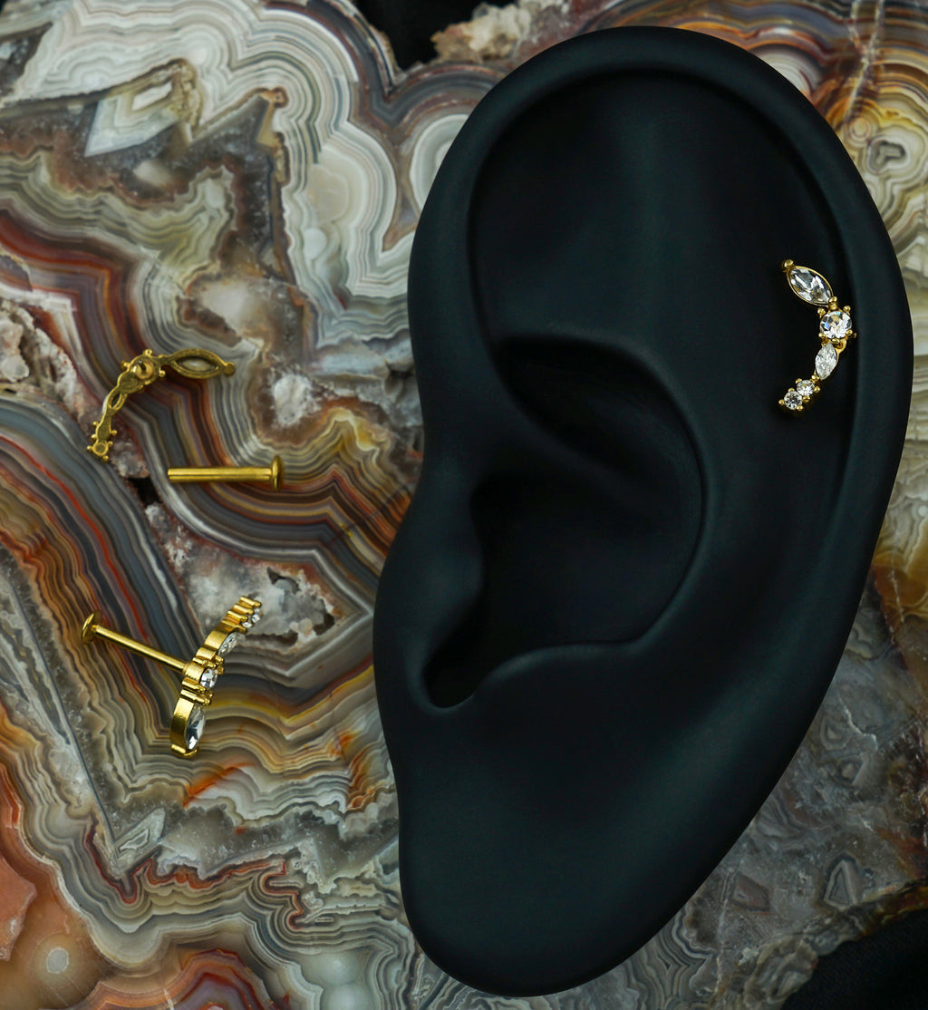 Made from gold pvd on ASTM F-136 titanium and featuring a sparkling curved CZ gem design that is made up of marquise-shaped, clear cz gems. The threadless design makes changing your piercings a breeze, while the convex disk ensures a secure fit. Available in 18G and 16G with a 5/16" (8mm) inner length, it’s perfect for all your favorite ear piercings. Add some shine and shimmer to your collection today!