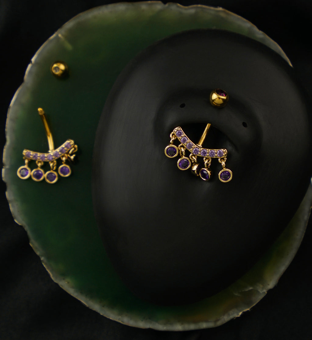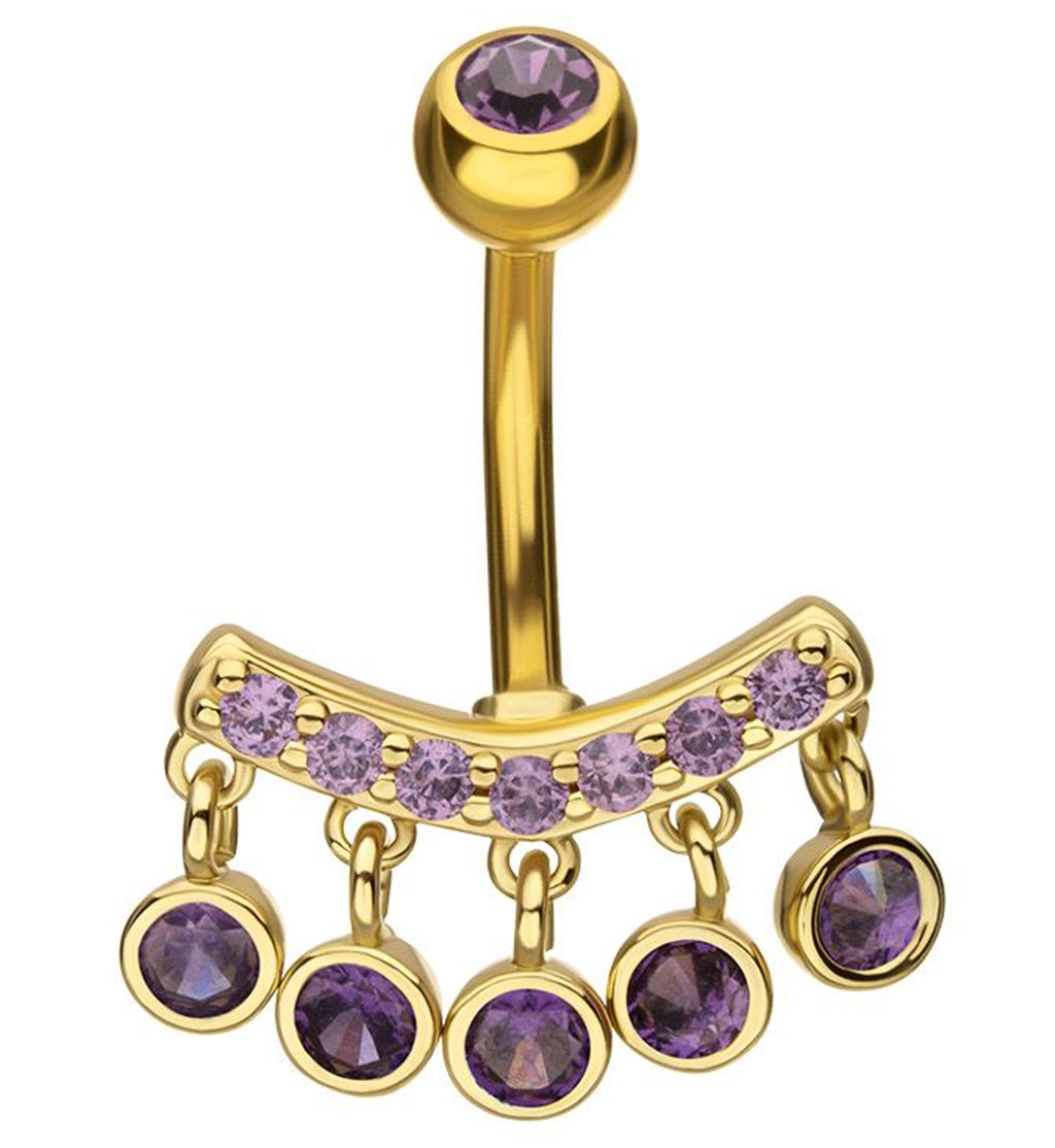 Golden belly ring that has a curved shape filled with amethyst cz gems and is accented with five, bezel-set, amethyst cz gems dangling from it. The top cz gem is upward facing, bezel set and amethyst as well. The belly ring has a wearable length of 3/8" (10mm) and a gauge size of 14G. Overall, the design measures around 20mm x 16mm (including dangles). Made from gold pvd on 316L stainless steel and is externally threaded with M1.2 threading. Meant for healed piercings only. Sold individually.