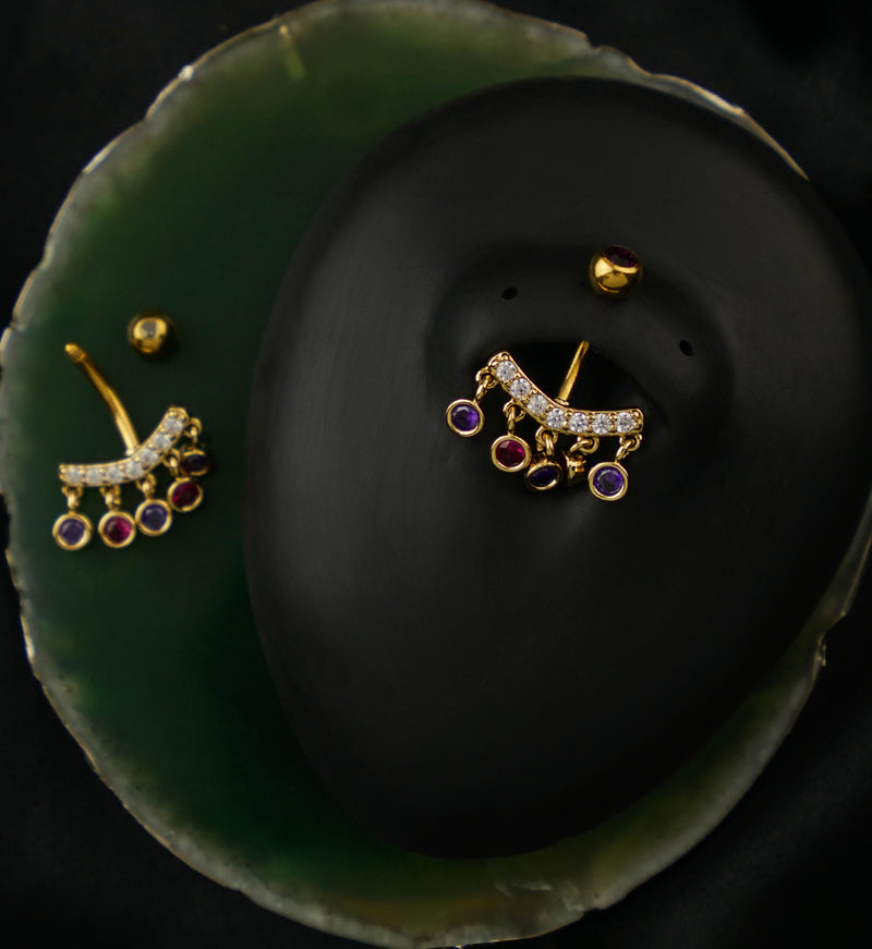 Golden belly ring that has a curved shape filled with clear cz gems and is accented with five, bezel-set, cz gems dangling from it. These gems alternate in color from amethyst and fuchsia. The top cz gem is upward facing, bezel set and amethyst colored. The belly ring has a length of 3/8" (10mm) and a size of 14G. Overall, the design measures around 20mm x 16mm (including dangles). It is made from gold pvd on 316L stainless steel and is externally threaded with M1.2 threading. For healed piercings only. Sold individually.