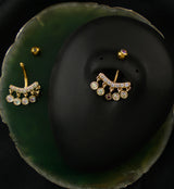 Golden belly ring that has a curved shape filled with rainbow aurora cz gems and is accented with five, bezel-set, rainbow aurora cz gems dangling from it. The top cz gem is upward facing, bezel set and rainbow aurora as well. The belly ring has a length of 3/8" (10mm) and a size of 14G. Overall, the design measures around 20mm x 16mm (including dangles). Made from gold pvd on 316L stainless steel and is externally threaded with M1.2 threading. For healed piercings only. Sold individually.