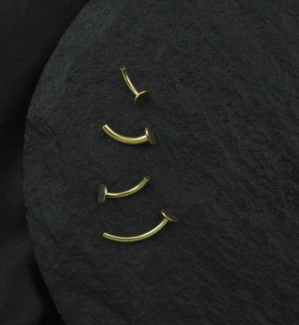 This curved barbell comes in 16G and 14G sizes, and is made of gold PVD ASTM F-136 titanium with an internally threaded post and a 4mm flat disk. With a variety of lengths available, this jewelry piece is suitable for a range of piercings. Sold individually.