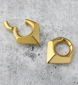 Golden V-shaped hinged ear weights. Made from gold pvd on 316L stainless steel with a magnetic hinged design. Height is 37mm, width is 33mm, weight is 28 grams each. 2G or bigger to wear. Sold in pairs (2pcs).