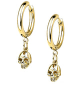 Edgy hoop-style earrings with a dangling skull attached. Made from gold pvd on 316 stainless steel. Size is 20G. Sold in pairs (2 pieces). For healed lobes/piercings.
