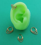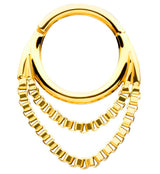 Golden segment ring made from gold pvd on 316L stainless steel with a hoop shape and an attached, dangling, double box chain design. Size is 16G with an inner diameter size of either 5/16" (8mm) or 3/8" (10mm). The hinged design makes this piece easy to put in and take out. Sold individually (1pc).