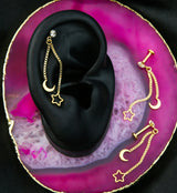 This golden internally threaded labret is a dangling piece to add to your jewelry collection. It features a sparkling clear 3mm gem and is made from gold pvd on 316L stainless steel. It also features 35mm dangling design consisting of two box chains with a half moon on the end of one and a hollow star on the end of the other. Choose between two different size wearable lengths: 1/4" (6mm) and 5/16" (8mm). It has a 4mm flat back. Sold individually (1pc). For healed piercings.