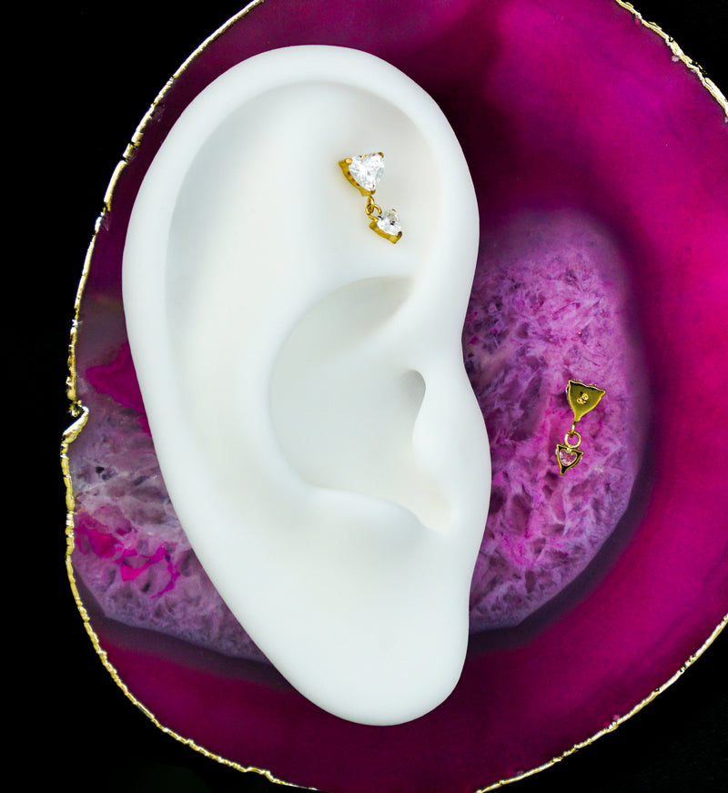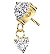 Threadless top piece that has a heart shaped clear cz gem with another dangling clear cz heart gem attached. Made from gold pvd on ASTM F-136 titanium. Measures at about 11mm x 4.5mm. Fits most threadless posts. Total length including pin: 7mm. Sold individually (top piece only).