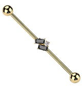 Industrial barbells with a double, slanted, baguette-shaped black cz gem design in the center that is accented with a single, clear cz gem. Made from gold pvd on 316L stainless steel. Design is about 8mm x 6mm. Size is 14G with a barbell length of 1-1/2" (38mm) and 5mm ball ends. Externally threaded and intended for healed piercings. Sold individually.