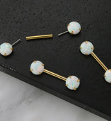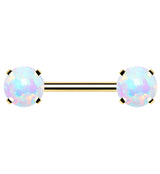 Double prong set synthetic white opal gem threadless barbells! Made with gold pvd on 316L stainless steel. Featuring a 14g straight barbell with a 1/2” barbell length. Accented with a 6mm opalite gem on either side depending on barbell length. Sold individually (1pc). If you'd like a pair, set quantity to 2.