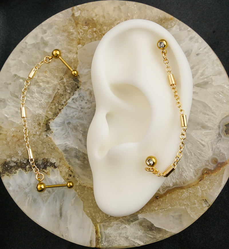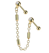 Golden, stainless steel piercing chain that is decorated with steel links throughout. The wearable size of each barbell is 18G with a 5/16" (8mm) length. The chain length measures 54mm. On each barbell is a 4mm clear cz gem with a 3mm ball on the other end. Both ends are externally threaded. Made from gold pvd on 316L stainless steel. Sold individually. For healed piercings.