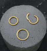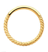 Hinged segment ring made from gold pvd on 316L stainless steel with a twisted design. Size is 16G. Inner diameter sizes: 5/16" (8mm), 3/8" (10mm). The hinged design makes this piece easy to insert and remove. Sold individually (1pc).