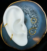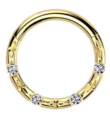 Titanium hinged segment ring made from gold pvd on ASTM F-136 titanium with a hoop shape that is accented with baguette shapes that have faceted cuts and clear cz gems. This 16G piece has an inner diameter size of either 5/16"(8mm) or 3/8" (10mm). The hinged design makes this piece easy to put in and take out. Golden piece for septum, cartilage or conch piercings! Sold individually. For healed piercings.