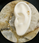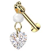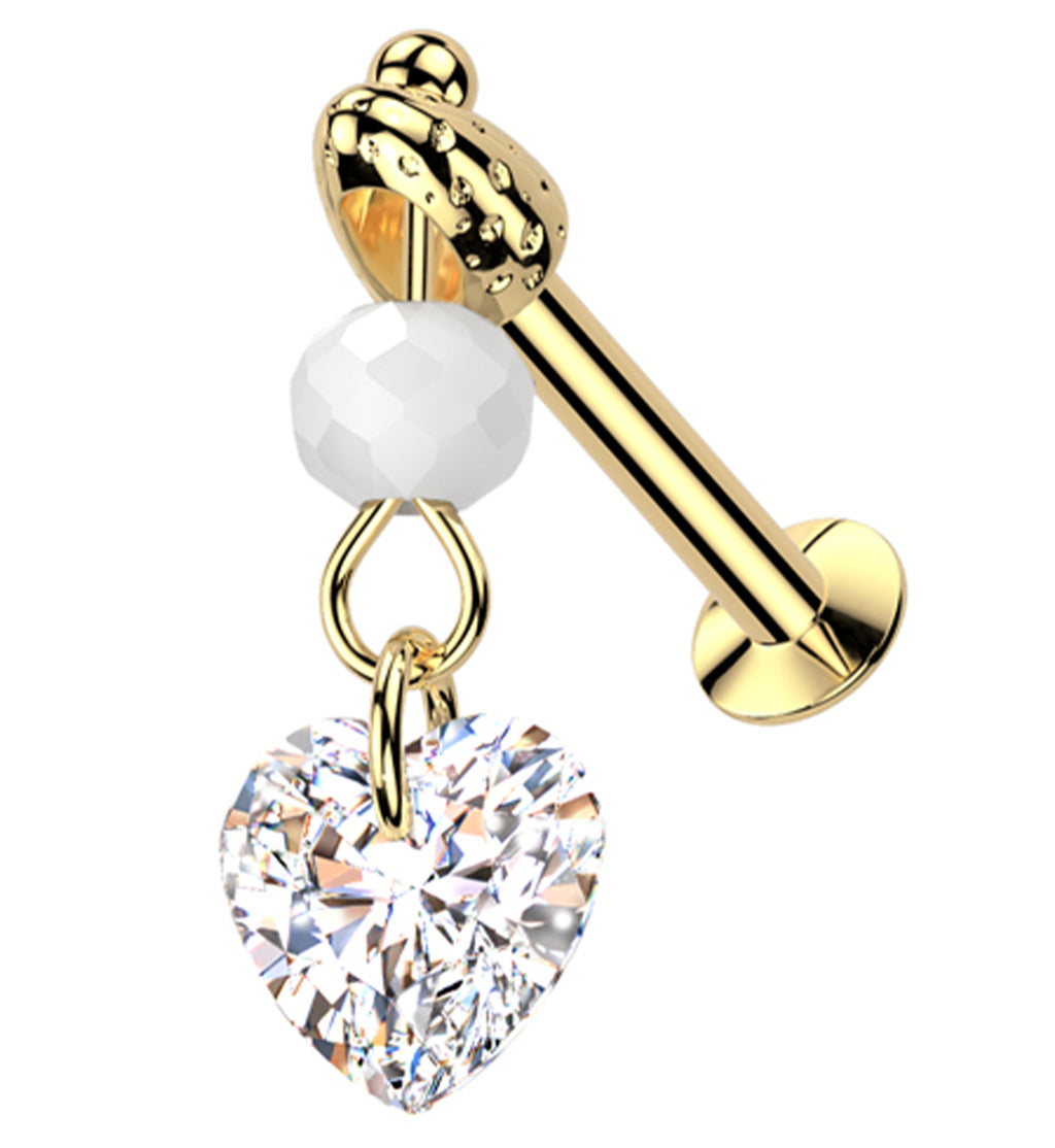 Golden threadless labret that features a dangling design that has a hammered cone design with a faceted bead dangling with a clear, heart-shaped cz gem attached. Created from gold pvd on 316L stainless steel. Choose your gauge size from 18G and 16G. The wearable area size is 5/16" (8mm) with a 3mm convex back. Top design measures 14mm x 3mm. Sold individually. Unique jewelry piece for your cartilage piercing! For healed piercings.