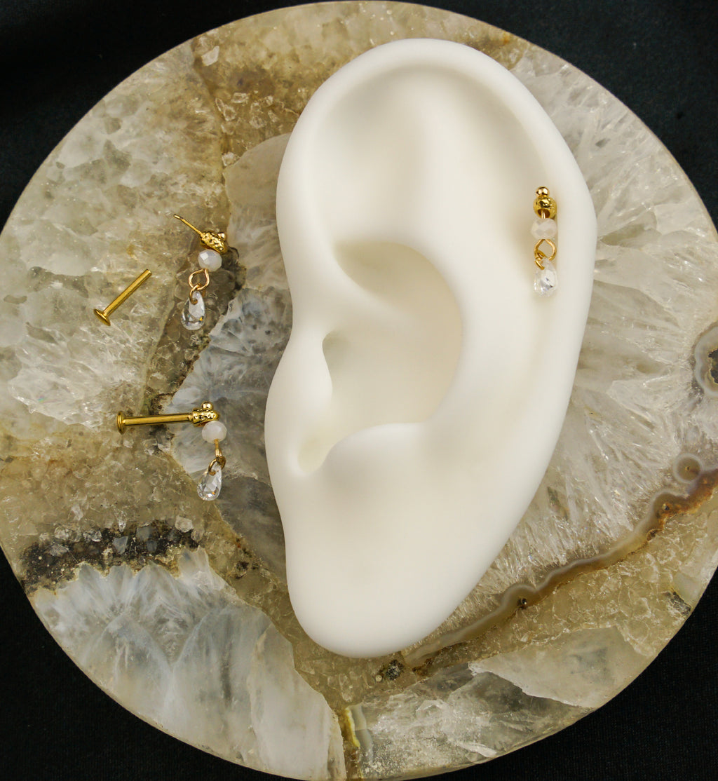 Golden, threadless labret that features a dangling design that has a hammered cone design with a faceted bead dangling with a clear, teardrop cz gem attached. Made from gold pvd on 316L stainless steel. Choose your gauge size from 18G and 16G. The wearable area size is 5/16" (8mm) with a 3mm convex back. Top design measures about 14mm x 3mm. Sold individually. Golden piece for your cartilage piercing!