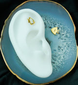 Made from gold pvd on ASTM F-136 titanium, this top is sold individually (1pc) and the striking fish design is filled with baguette-shaped, synthetic, white opal gems. The 25G pin size and 10mm x 10mm design make it a golden addition for most threadless posts.