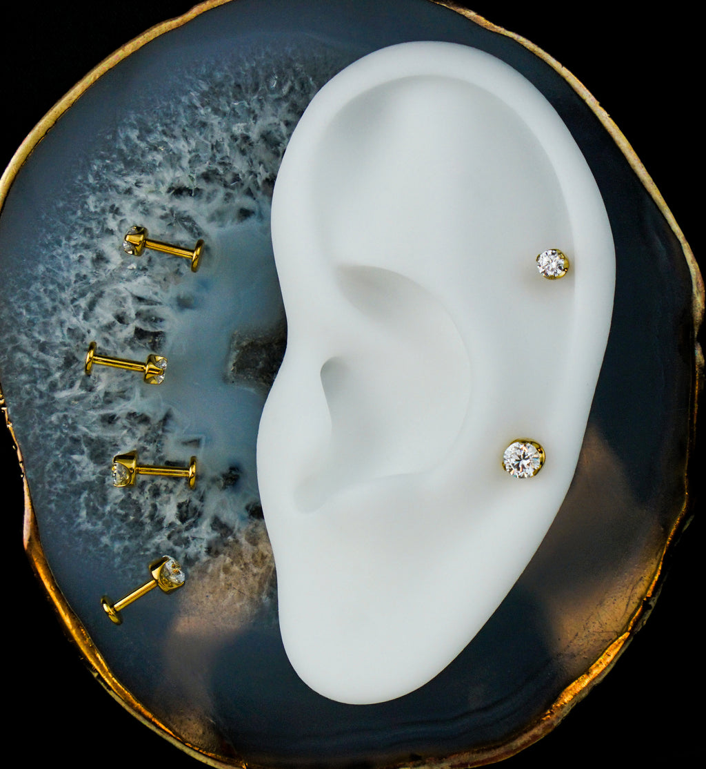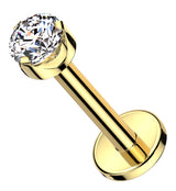 Gold PVD Flat Back Prong Clear CZ Internally Threaded Titanium Labret