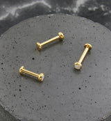 Golden, simple labret piece for your piercing! Internally threaded labret piece that has a synthetic white opal gem on top. Made from gold pvd on ASTM F-136 titanium. Size is 16G. Available in two lengths: 1/4" (6mm) and 5/16" (8mm). Both have a 3mm sized gem top. Sold individually (1pc). For healed piercings.