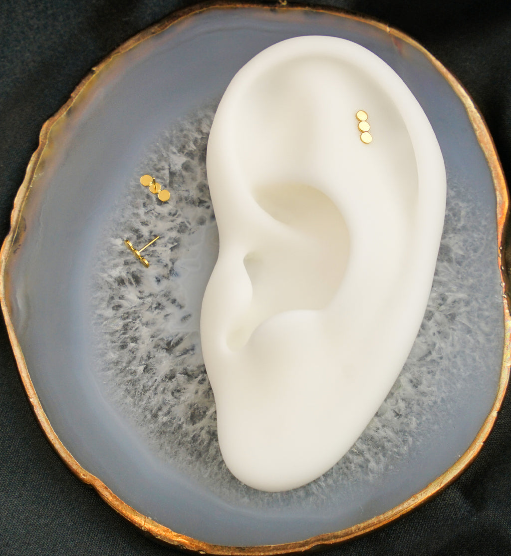 This golden threadless top piece has a stacked, triple sphere design that has a smooth, flat surface. Pin size is 25G so it fits most threadless tops. The top size is 6mm x 2mm. It is made from gold pvd on ASTM F-136 titanium. Effortless to insert and take out. Sold Individually - top only.