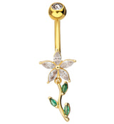 Gold PVD Flower Clear And Emerald CZ Dangle Stainless Steel Belly Button Ring