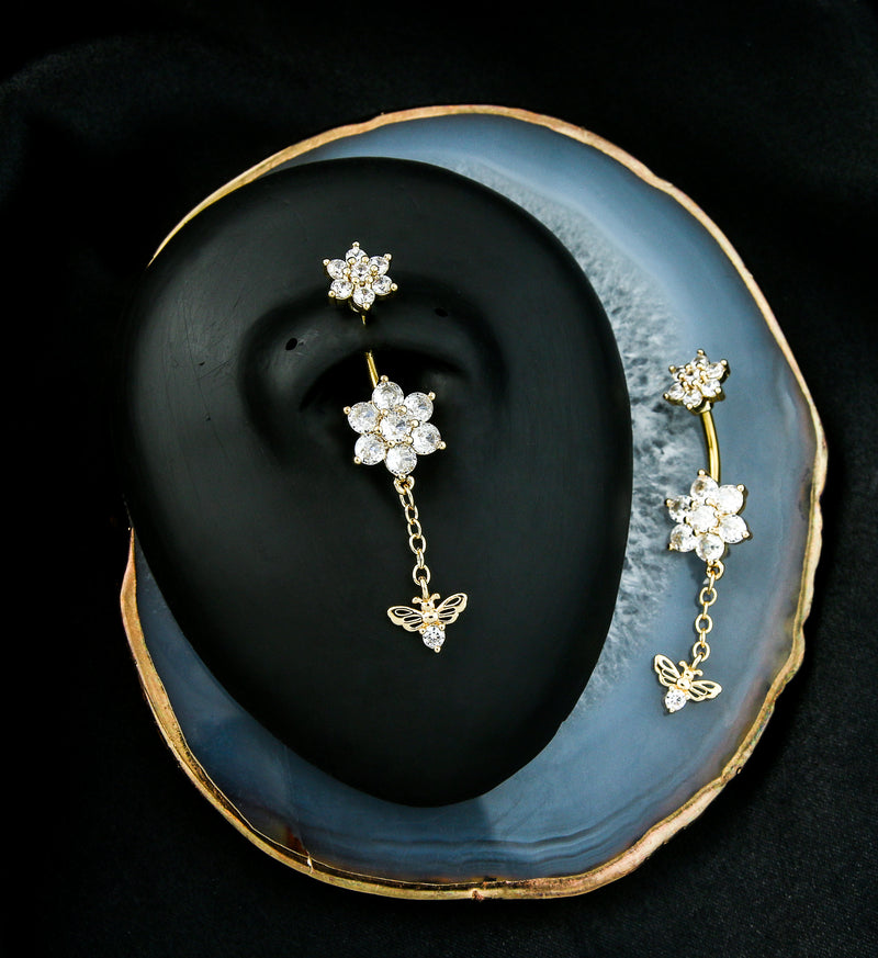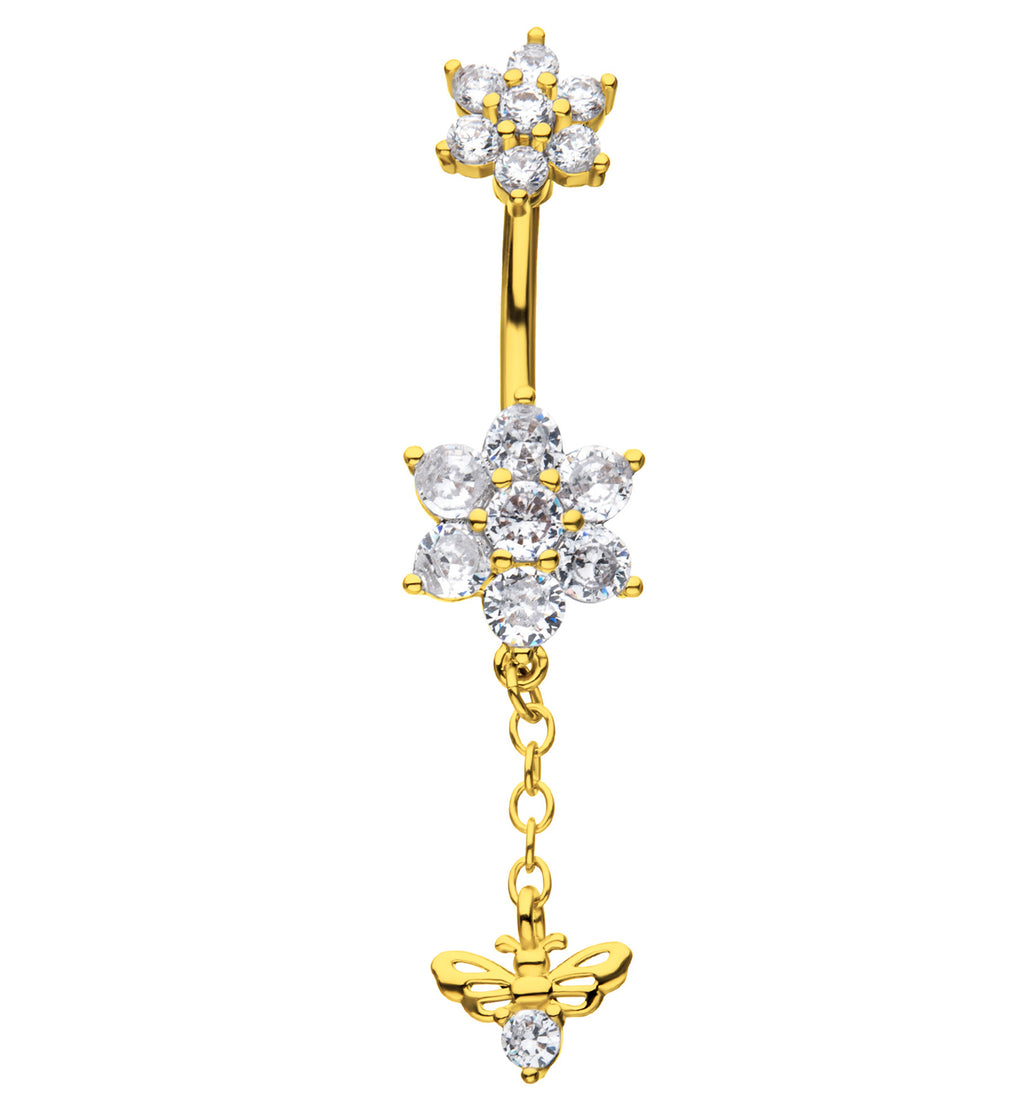 Golden, externally threaded, belly button ring made from gold pvd on 316L stainless steel with a flower design on top and bottom with a dangling bee design. Each flower and bee design is filled with clear cz gems. The top flower design measures about 8mm and the bottom flower design measures about 10mm. The chain and dangle bee design measures about 20mm long. Size is 14G with a 3/8" (10mm) length. For healed piercings. Sold individually (1pc).