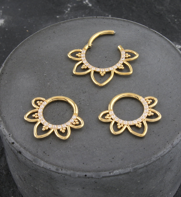 Hinged segment ring made from gold pvd on ASTM F-136 titanium with a flower-like, lined design along the bottom that is accented with 3-bead clusters and sparkling, clear cz gems. Size: 16G. Choose your inner diameter size: 5/16" (8mm), 3/8" (10mm). The hinged design makes this piece easy to insert and remove. Sold individually (1pc).