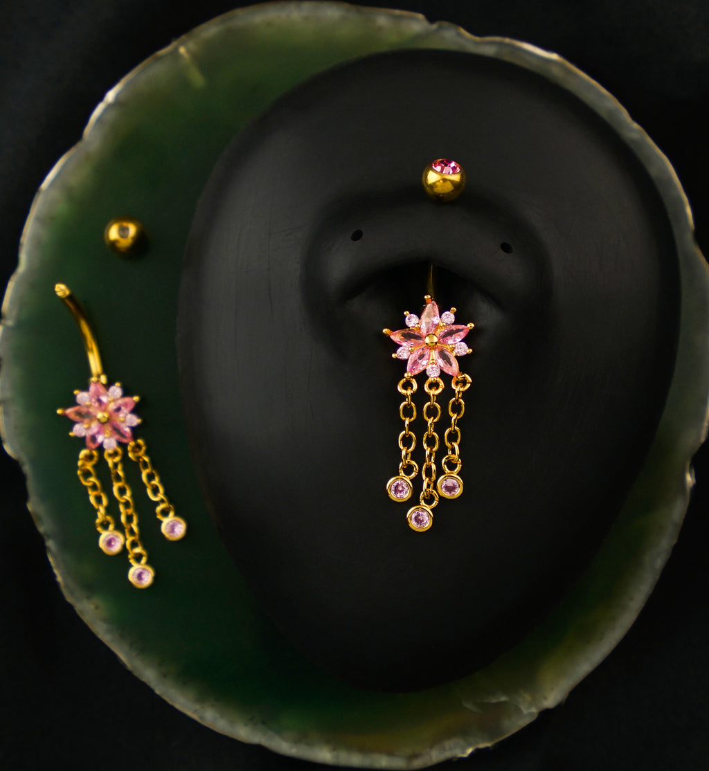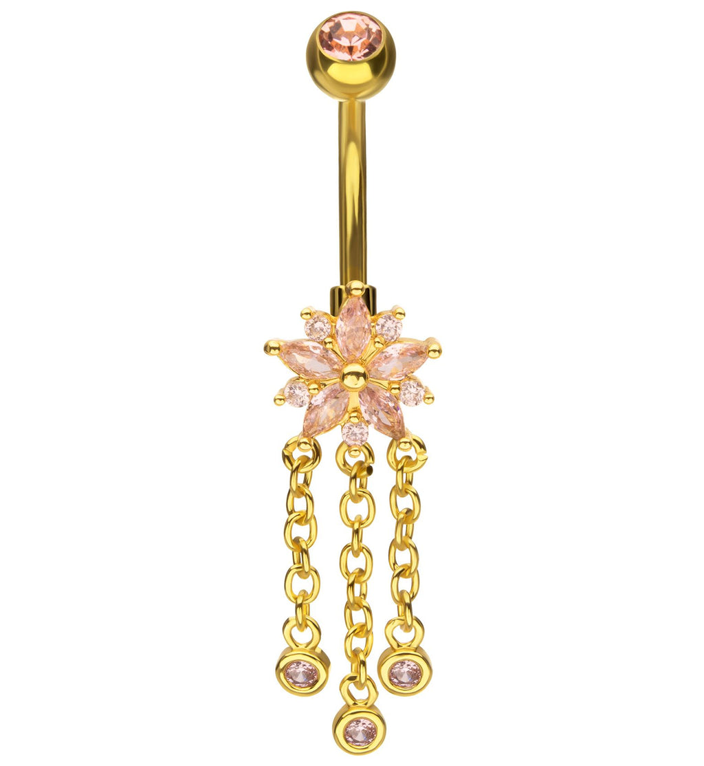 Beautiful belly ring that has a flower design that consists of round and marquise pink cz gems. Attached are three dangling chains with bezel-set, pink cz gems on the bottom. Each dangling gem measures about 2mm. The belly ring has a wearable length of 7/16" (11mm) and a size of 14G. Overall, the design measures 27mm x 10mm (including dangles). It is made from gold pvd on 316L stainless steel and is externally threaded with M1.2 threading. For healed piercings only. Sold individually.