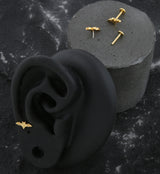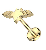 Threadless labret piece that has a flying bat design. Made from gold pvd on ASTM F-136 titanium with a 4mm disk back. Measures about 10mm x 4mm. Size is 18G with a 5/16" (8mm) length. Sold individually (1pc).