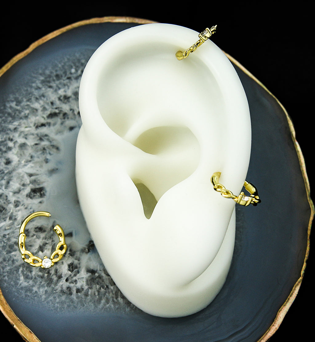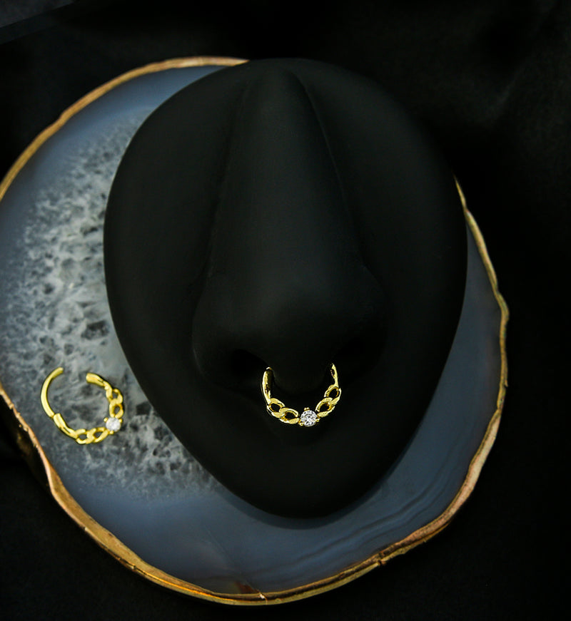 This 16G Frontal Chain is the perfect piece to add to your rotation. Its designed to look like a linked chain. In the center it has a 2mm clear cz gem. It has an inner diameter of 5/16" (8mm). The hinged makes this piece easy to insert and remove. This hinged ring is made from gold PVD on 316L stainless steel. For healed piercings. Sold individually (1 piece).