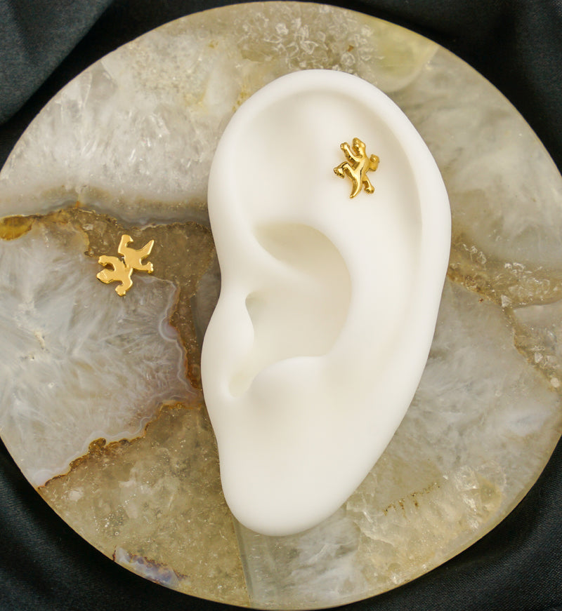 This threadless top has a cute, gecko design and smooth/polished texture. It is made from gold pvd on ASTM F-136 titanium and is threadless with a 25G pin. The threadless design makes this piece effortless to put in and take out from your piercing. The top design measures 12mm x 8mm. Sold individually.