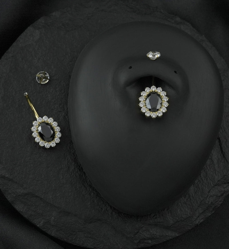 Made with premium ASTM F-136 titanium, this belly ring is internally threaded for a comfortable fit. The top 5mm gem is clear cz and the bottom 13mm x 10mm design features a black oval CZ gem surrounded by clear cz gems. Sold individually in size 14G and 3/8" (10mm) long. Fun and stylish!