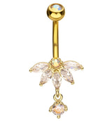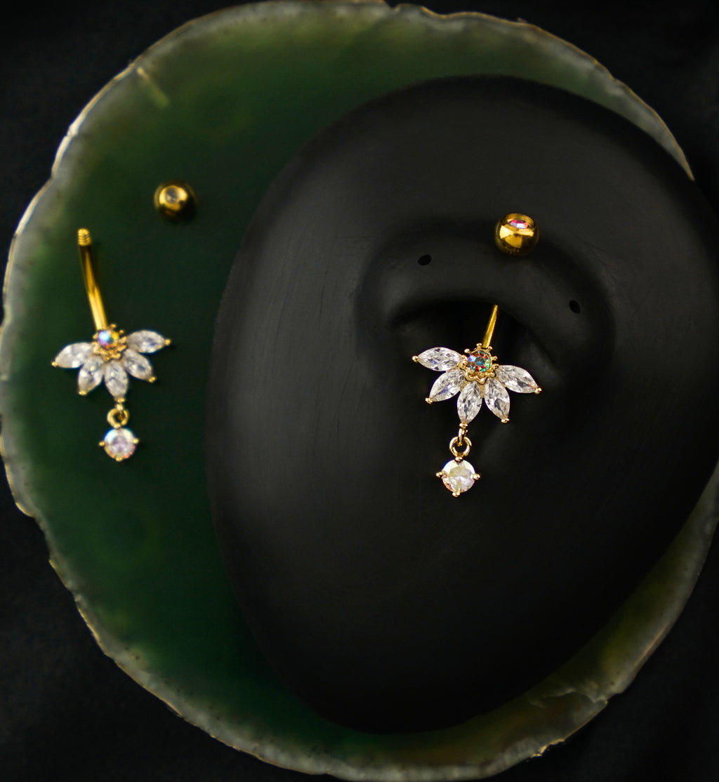 Fun navel ring that has a half flower design that consists of five, marquise, clear cz gems and a rainbow aurora cz gem in the middle. Attached is a dangling, rainbow aurora cz gem as an accent. The belly ring has a wearable area of 3/8" (10mm) and a size of 14G. Overall, the design measures around 17mm x 14mm (including dangles). It is made from gold pvd on 316L stainless steel and is externally threaded with M1.2 threading. Meant for healed piercings only. Sold individually.
