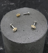 Internally threaded labret that consists of a cluster of clear cubic zirconia gems in the shape of a half flower on top of a labret piece. Made from gold pvd on 316L stainless steel. Size is 18G with a 1/4" (6mm) length. 3mm flat back. Top design measures at 5mm x 3mm. Sold individually (1pc).