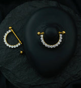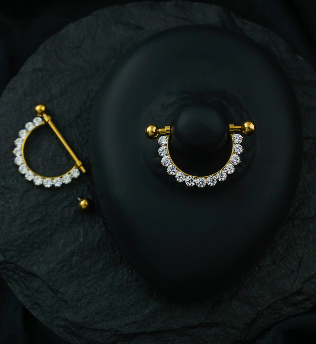 Golden nipple barbells that are internally threaded. These barbells are 14G with a wearable area of 9/16" (14mm). The ball ends are internally threaded and measure about 4mm each. The gold pvd ASTM F-136 titanium implant grade material ensures both quality and safety, while the clear, pave CZ gems wrap under the nipple for a sparkling accent. Sold in pairs. For healed piercings.