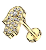 Gold PVD Hamsa Hand Clear CZ Threadless Titanium Labret