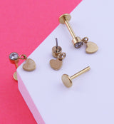 Golden titanium labret that features a bezel set 2.5mm clear cz gem that has a 4mm heart dangling from it. The gold pvd on ASTM F-136 titanium labret is threadless for easy installation and comes in either 18G or 16G with a 5/16" (8mm) length. The flat disk back measures 4mm. Sold individually (2pcs - top and bottom).