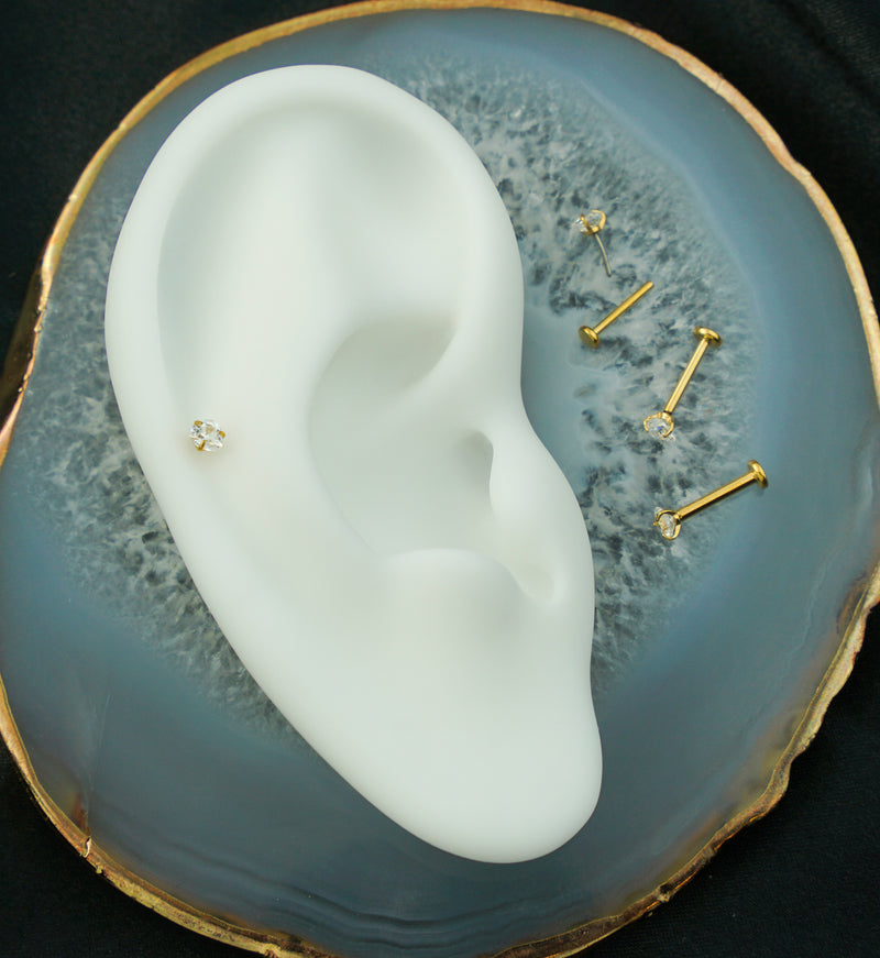 Made from gold pvd on ASTM F-136 titanium, this titanium threadless labret has a prong set, heart-shaped, clear cz gem on top. The gem measures about 3mm. It is made from ASTM F-136 titanium and has a 25G pin and a 3mm flat back. Sold individually, it is available in size 20G, 18G or 16G with a 5/16" (8mm) wearable area. Golden labret piece for cartilage or tragus piercings!