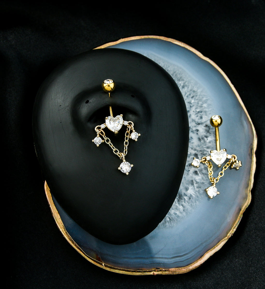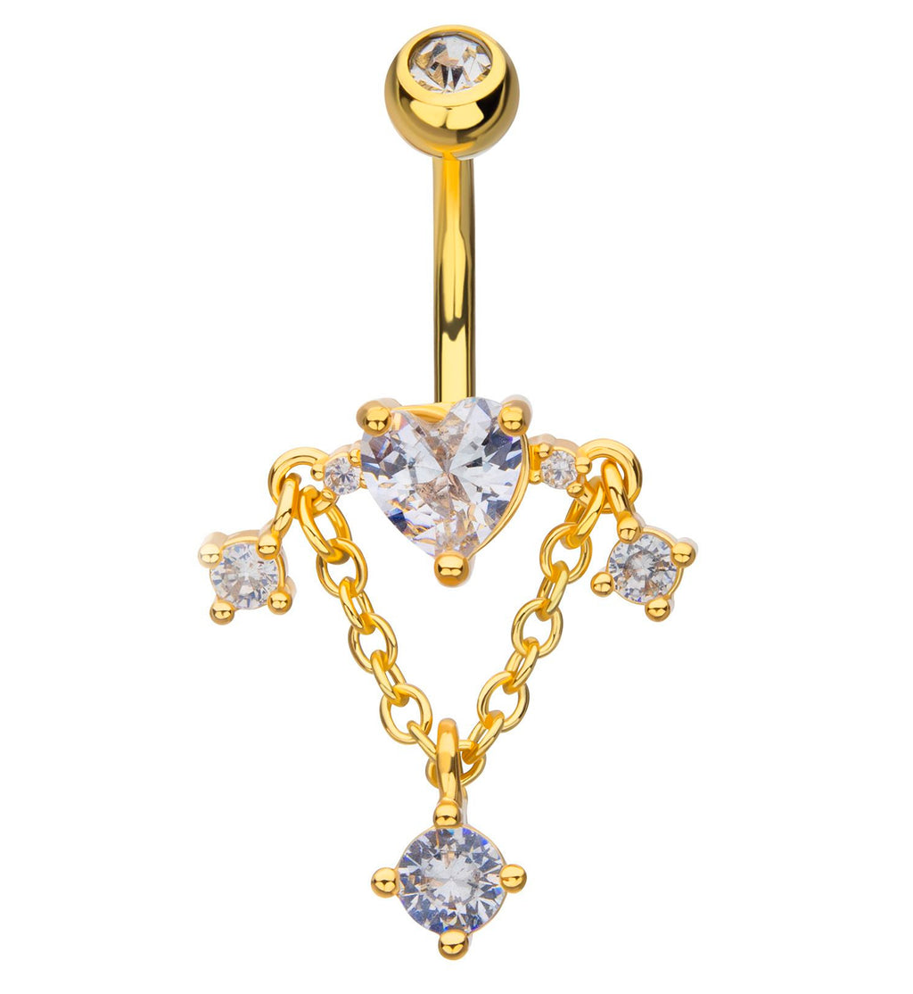 Golden, externally threaded, belly button ring made from gold pvd on316L stainless steel with a heart-shaped, clear cz gem with an attached, dangling chain that has three, dangling, clear cz gems. The design measures about 14mm x 20mm including the dangle. The top clear cz gem is 5mm. Size is 14G with a 3/8" (10mm) length. For healed piercings. Sold individually.