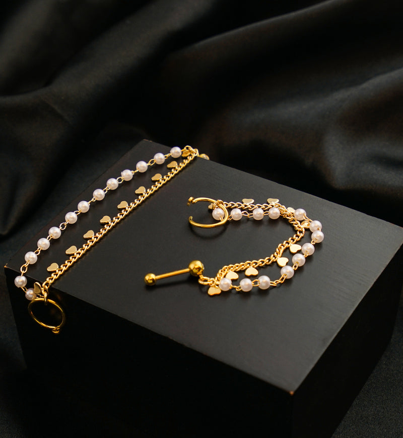 Gold PVD Hoop/Barbell Clear CZ Stainless Steel Pearl And Heart Dual Piercing Chain