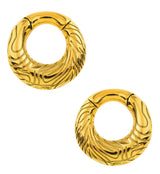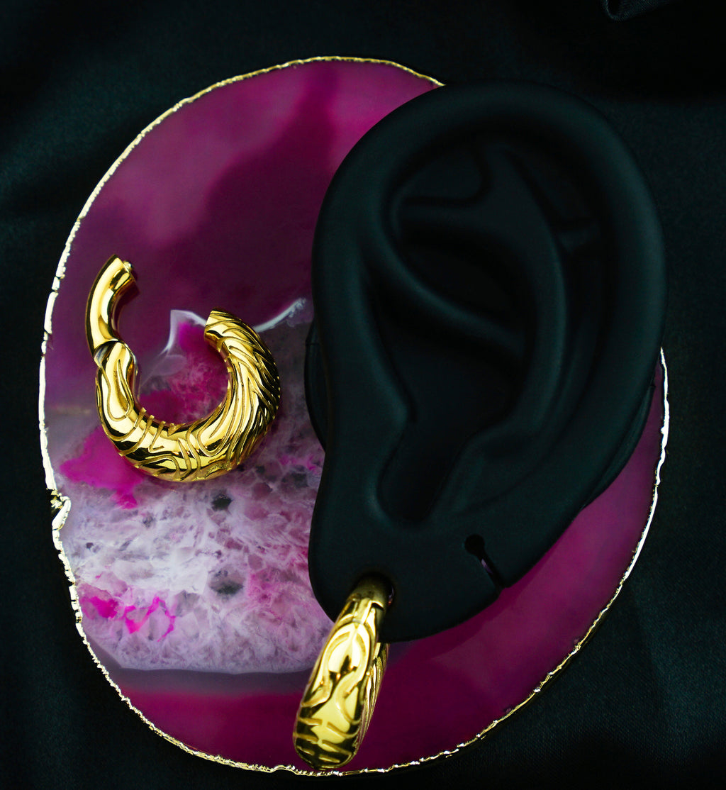 Golden, hinged ear weights with an etched line texture that resembles a fingerprint pattern. Made from gold pvd on 316L stainless steel with an easy hinged design. Height is 25mm, width is 25mm, weight is 15 grams each. Must be 6G or bigger to wear. For healed lobes/piercings. Sold in pairs (2pcs).