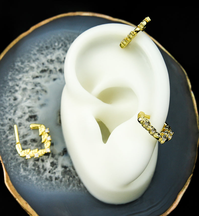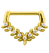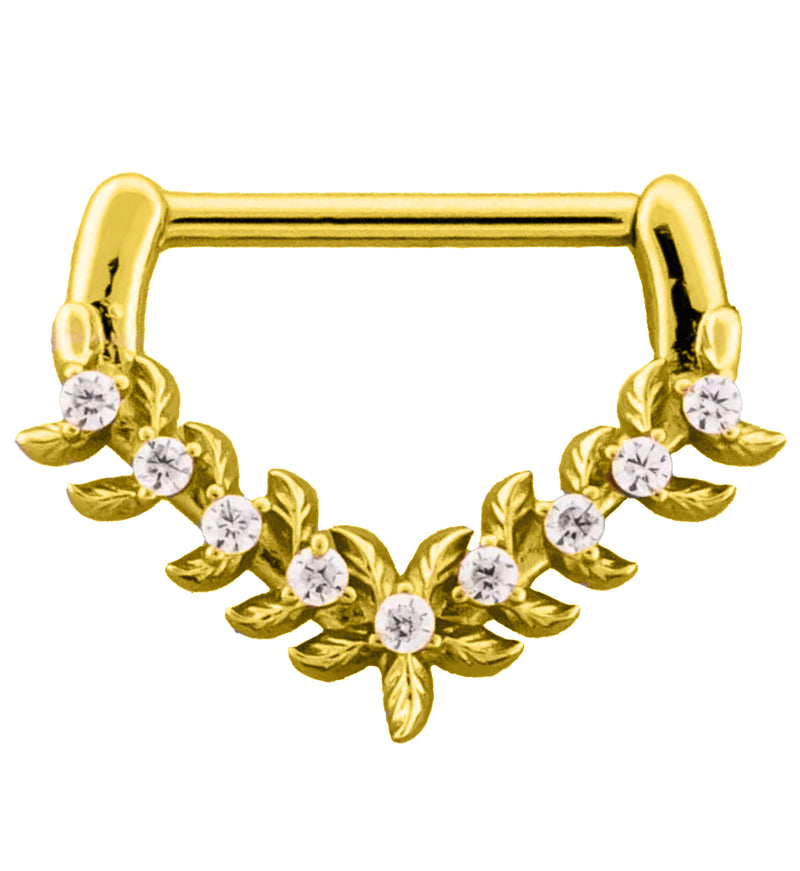 Made from gold pvd on 316L stainless steel, this hinged segment ring features a pointed, wreath design that is filled with clear CZ gems for a touch of sparkle. Its easy-to-open, straight, hinged design makes it convenient for healed piercings. Sold individually, it is available in 16G and has an inner diameter size of 5/16" (8mm).