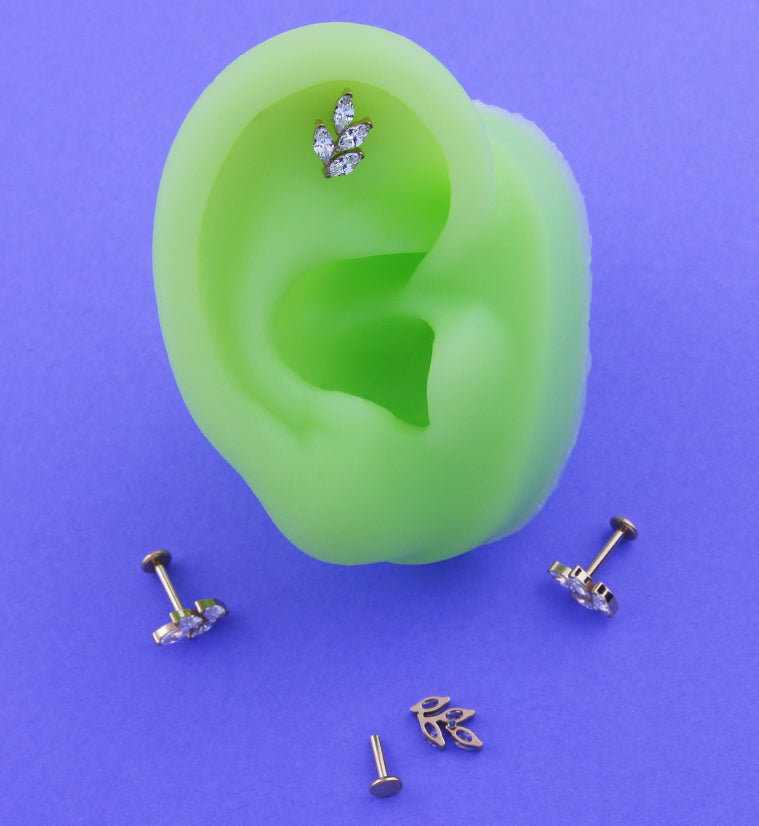 This golden titanium labret features a leaf design made up of clear marquise cz gems. The gold pvd on ASTM F-136 titanium is internally threaded for a secure fit and comes in two sizes – 1/4" and 5/16" lengths – for a design size of 10mm x 6mm. The flat disk backing measures 4mm. Sold individually (2pcs - top and bottom).