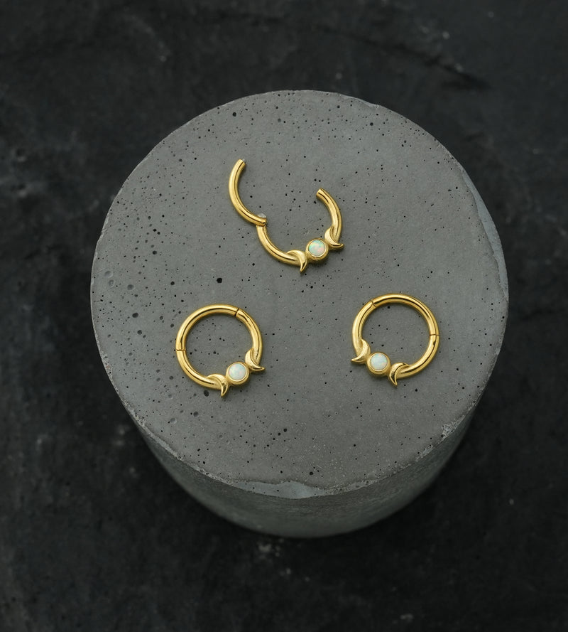 Hinged segment ring made from gold pvd on 316L stainless steel with a hoop shape and a moon phase design that has a single, bezel set synthetic white opal gem. Gem size is about 2mm. Size is 16G. Inner diameter size is 5/16" (8mm). The hinged design makes this piece easy to insert and remove. Sold individually (1pc).