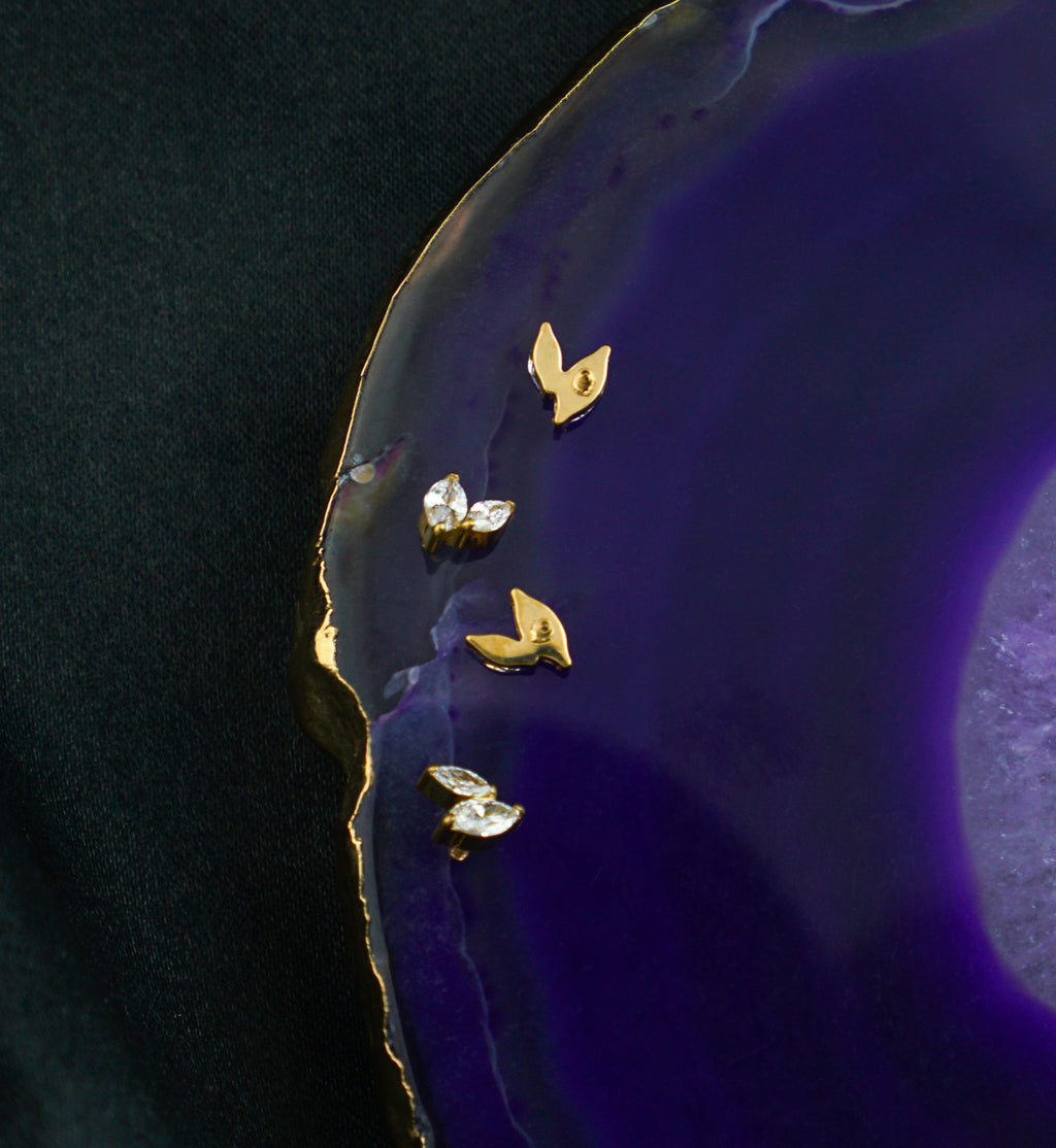 Internally threaded top piece that is shaped like a leaf as it has one big and one small, marquise-shaped, clear cz gems. Made from gold pvd on ASTM F-136 titanium. Measures about 6mm x 4mm. Size is 16G with M0.9mm threading. Golden jewelry piece for your cartilage, ear lobes or tragus piercing! Sold individually (top only).