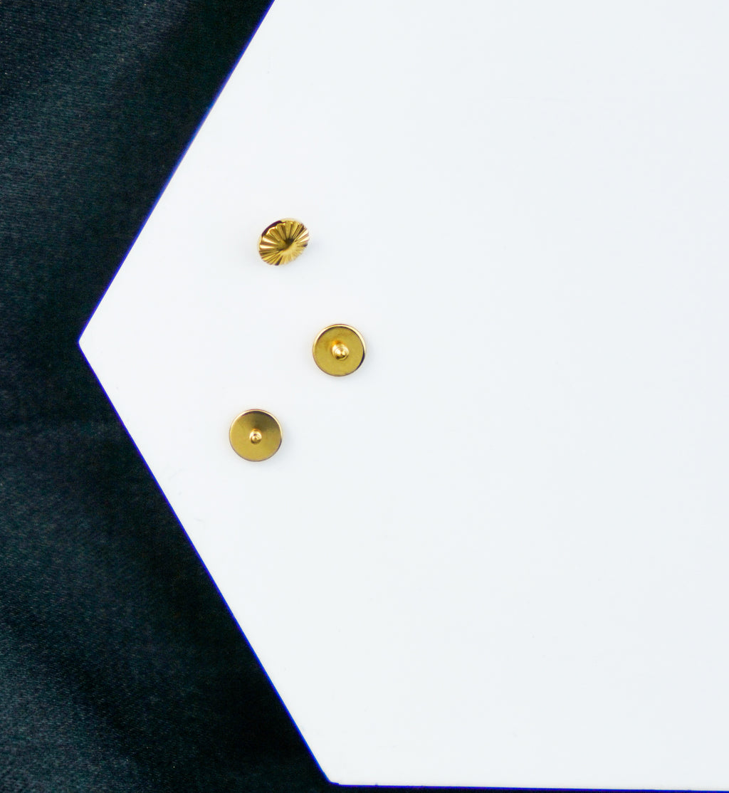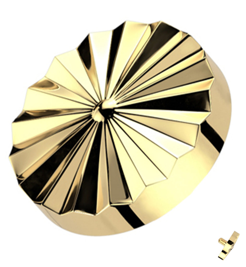 Golden, internally threaded top piece that has a 4mm, corrugated disk design. Choose your size between 16G and 14G with M0.9 or M1.2 threading. Made from gold pvd on ASTM F-136 titanium. Design measures about 4mm. Sold individually (top only).