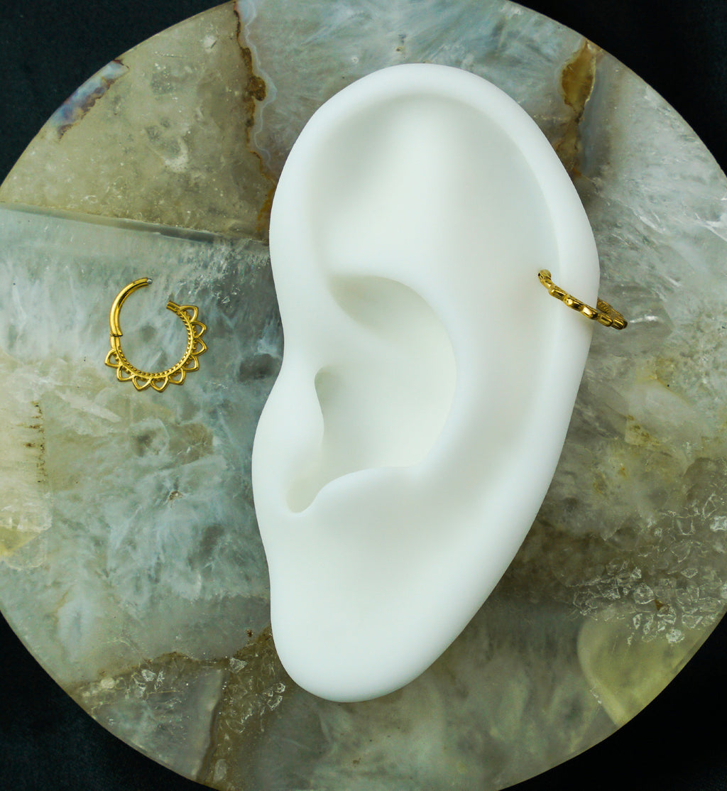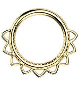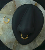 Made from 316L stainless steel and coated in gold PVD, this ring features a hinged segment for easy opening and closing. Perfect for septum piercings, available in size 16G with an inner diameter of 5/16" (8mm). Sold individually for healed piercings.
