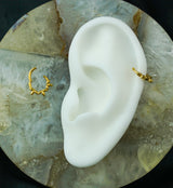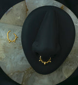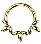 Made from shining 316L stainless steel with a gold PVD finish, this hinged ring features a unique design of olive leaves. Perfect for healed piercings, especially septum or cartilage piercings, and sold individually. Size: 16G, with an inner diameter of 5/16" (8mm).